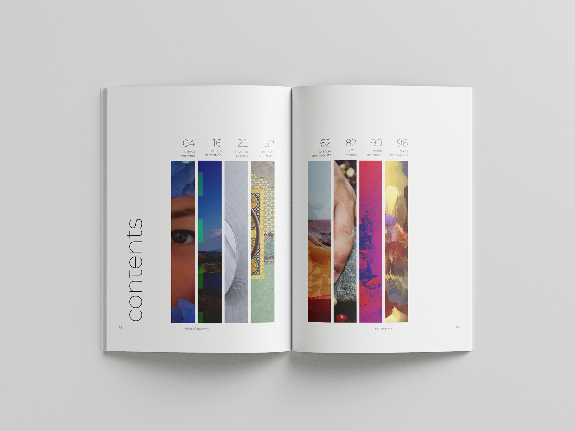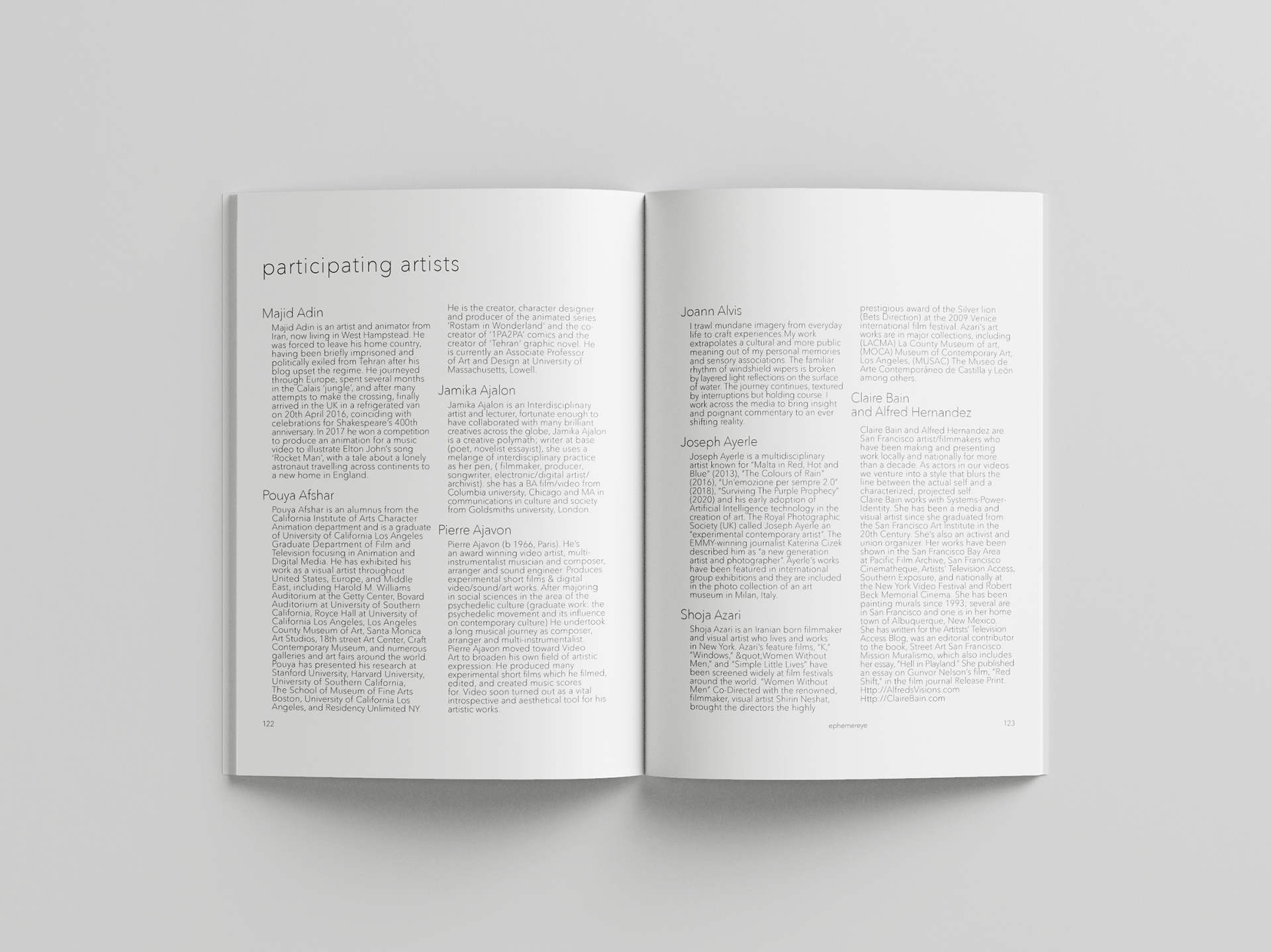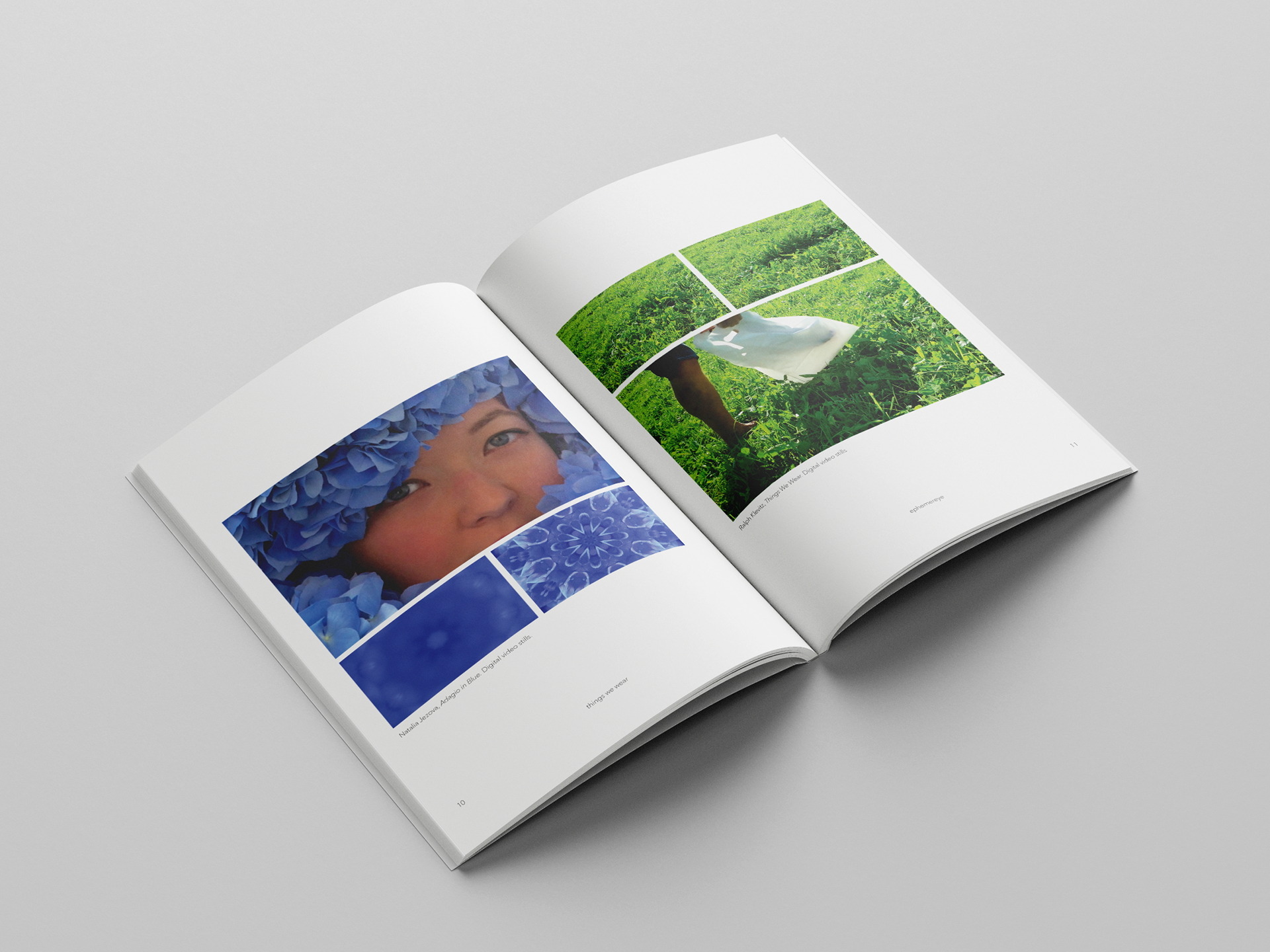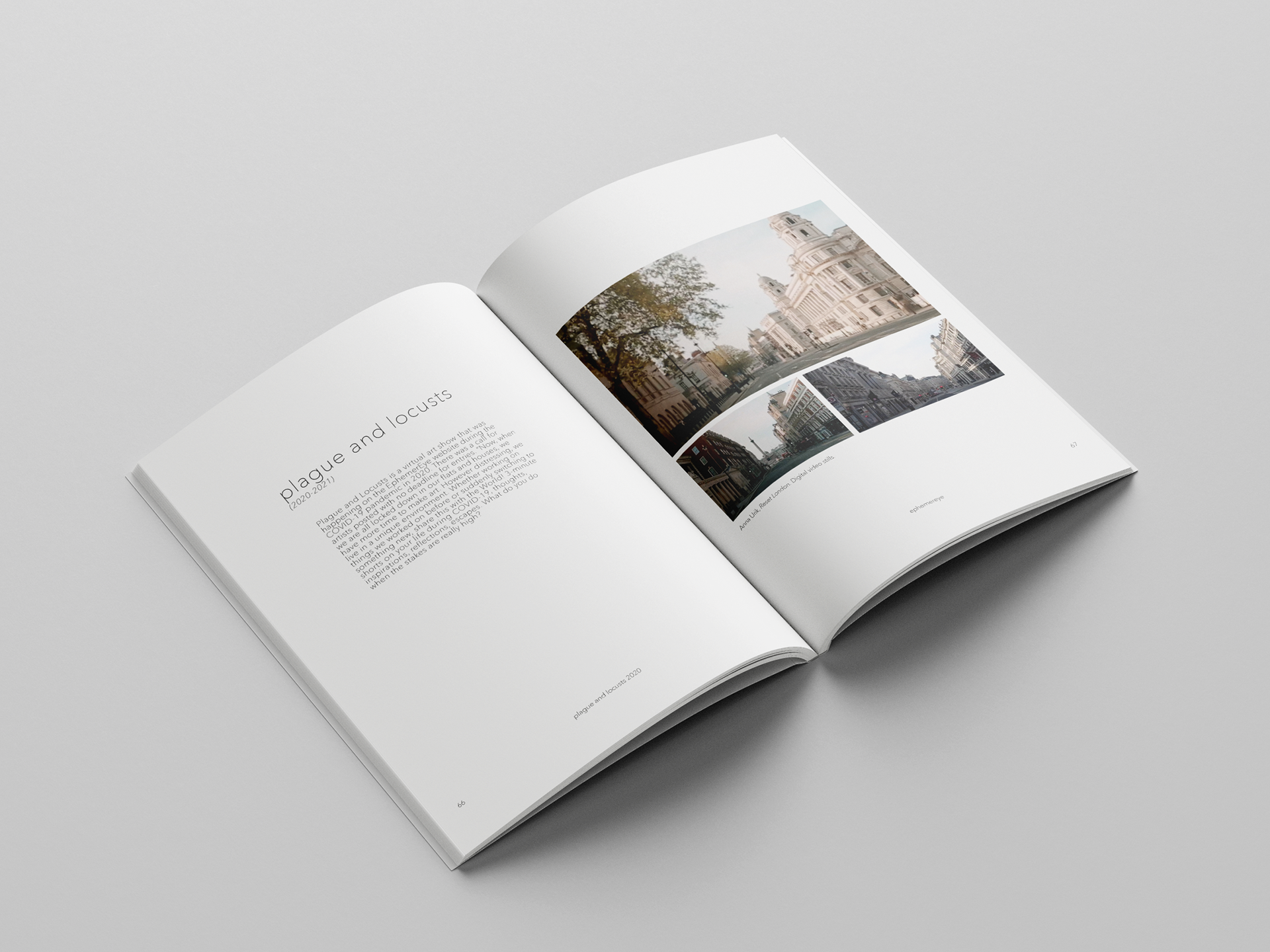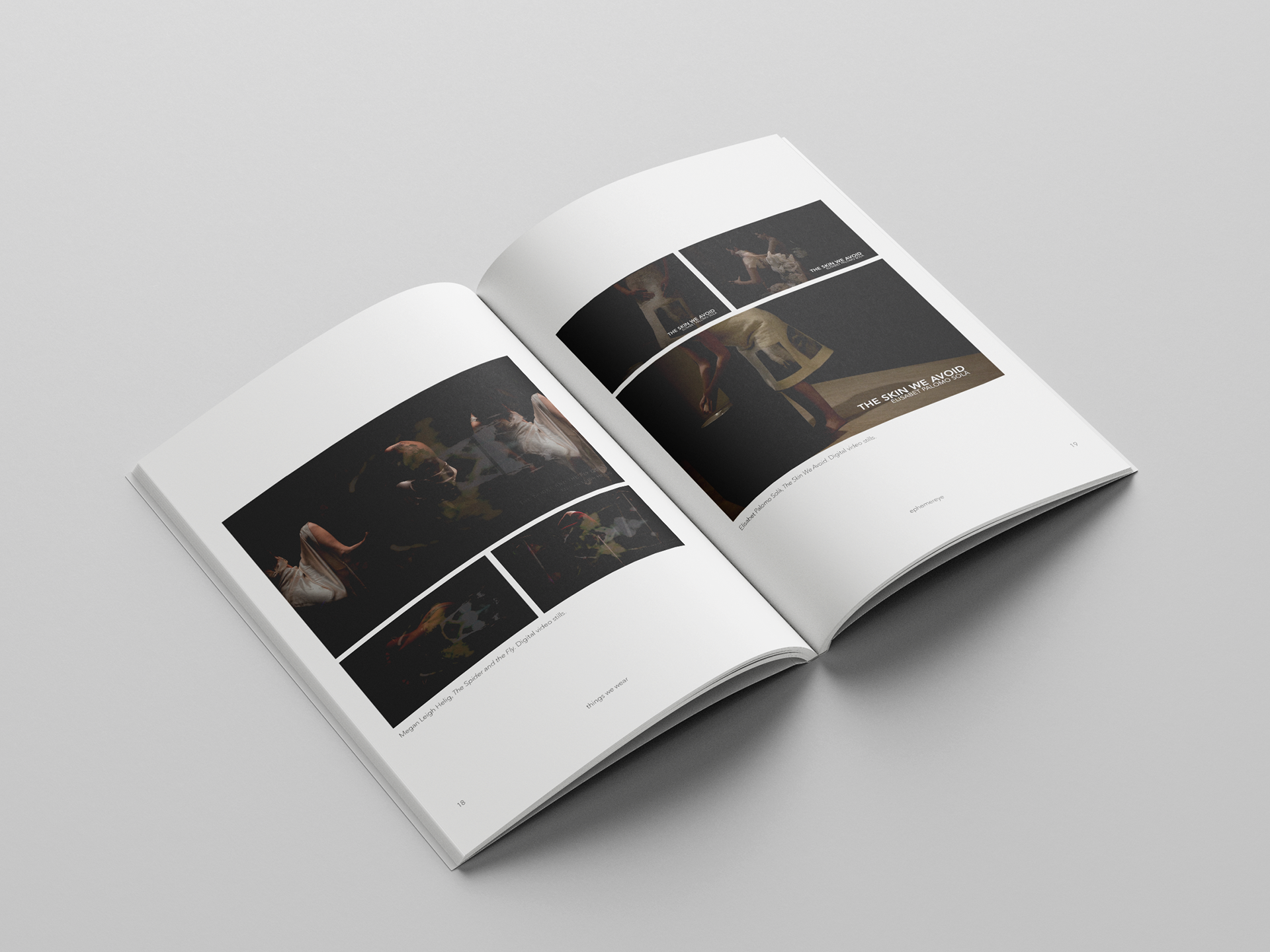 A coffee table book for previous and current art exhibitions at ephemereye. I worked with the client to showcase each video artwork in a series of three photos, with the artists' statement/bio at the end of the book.